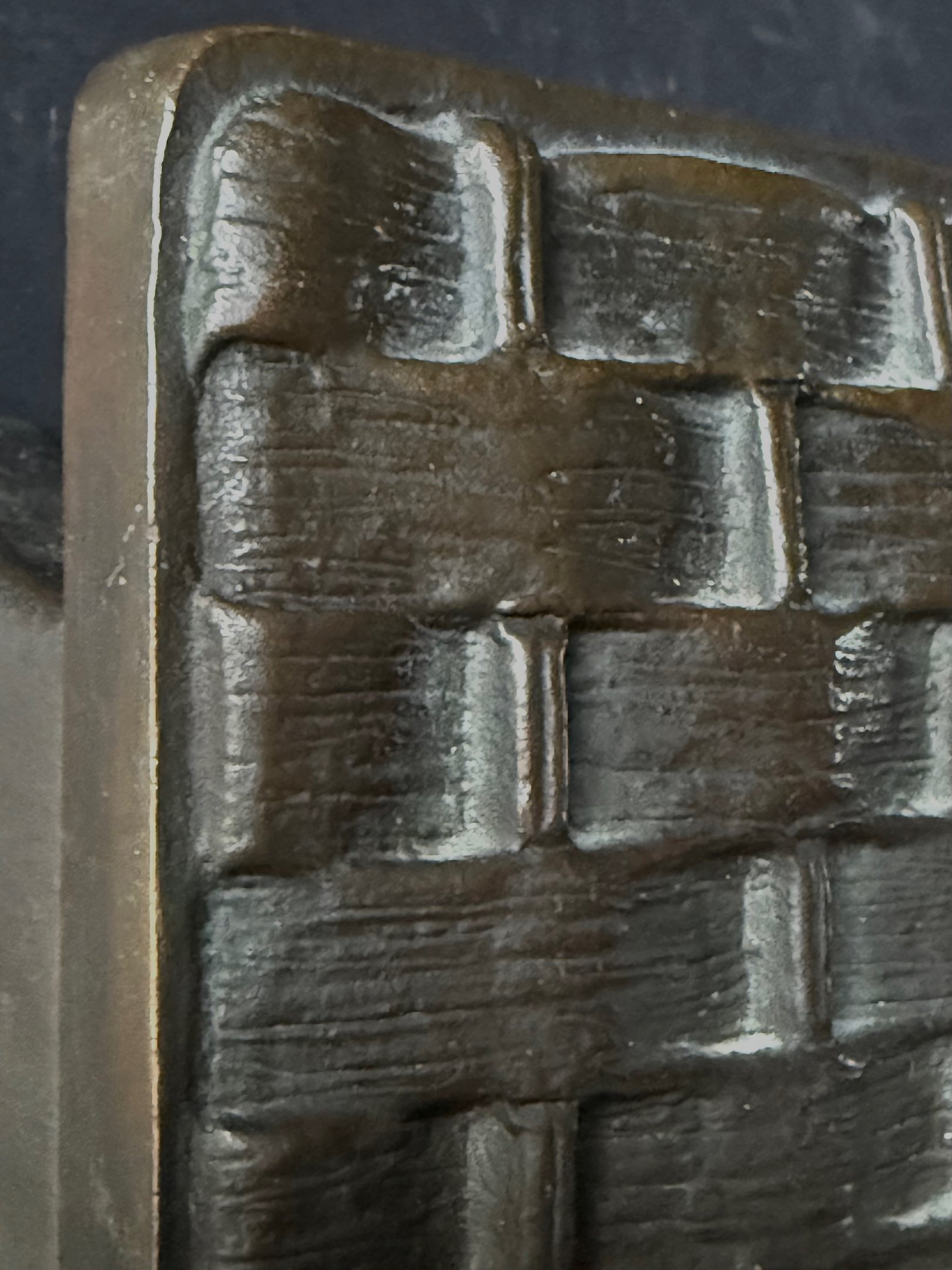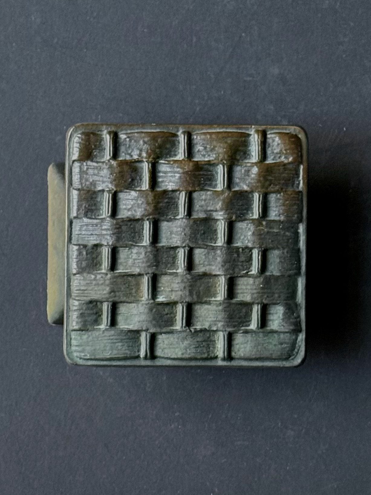 A square bronze push-pull door handle with a dark brown patina and raised basket-work pattern. Mid-to-late 20th century, European.