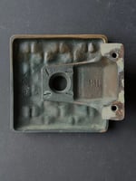 This is a heavy piece, made of cast and patinated bronze. We have not cleaned or polished the metal and it is offered as found. There are interesting changing tones from use, from dark brown (brighter in direct light) to warmer highlights along the top edge from years of handling. There are age-appropriate signs of wear, including green oxidation, and traces of old paint to the bracket. Patina suggests the piece was previously fitted with the bracket below the left side (as shown in the main image), but the design is symmetrical and has no defined orientation.
