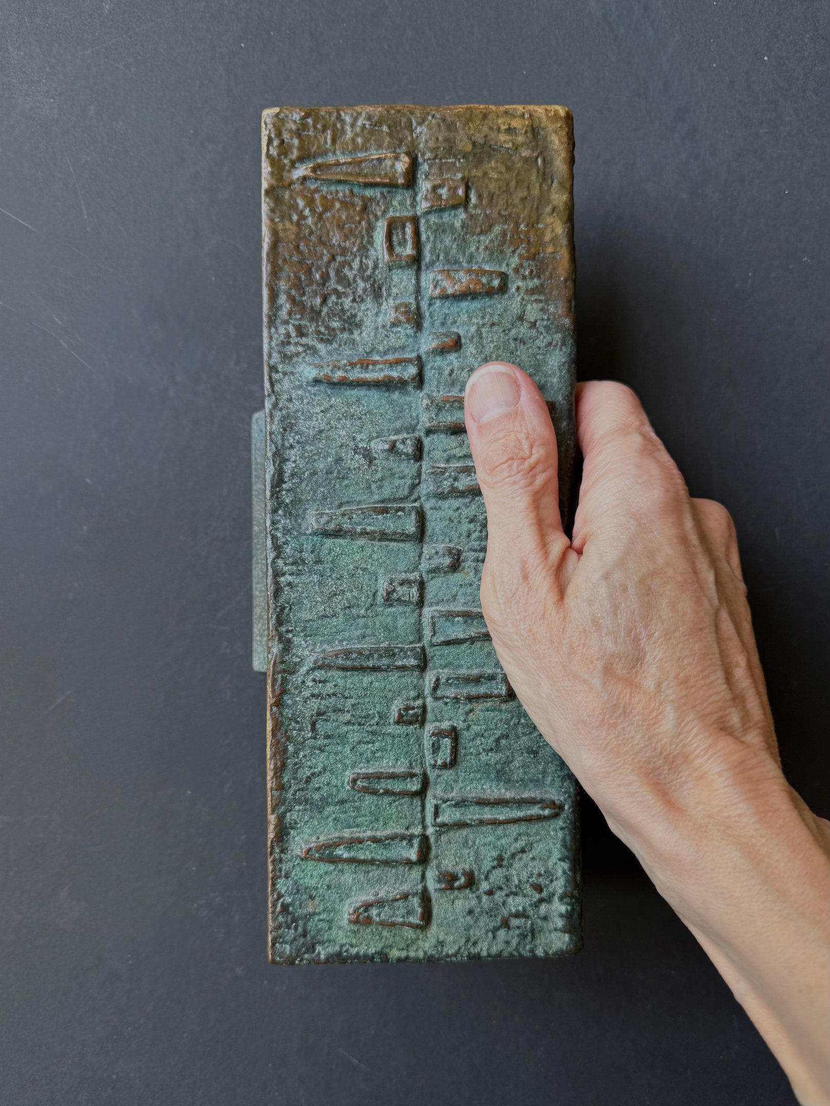 This is a heavy piece, made of cast bronze. We have not cleaned or polished the metal and it is offered as found. There are interesting changing tones from use, from green to golden brown. There are signs of wear in line with age and use, including green oxidation - particularly to the bracket - and rust to the fixings on the reverse. The design is abstract and, aside from the patina from use, has no defined orientation.