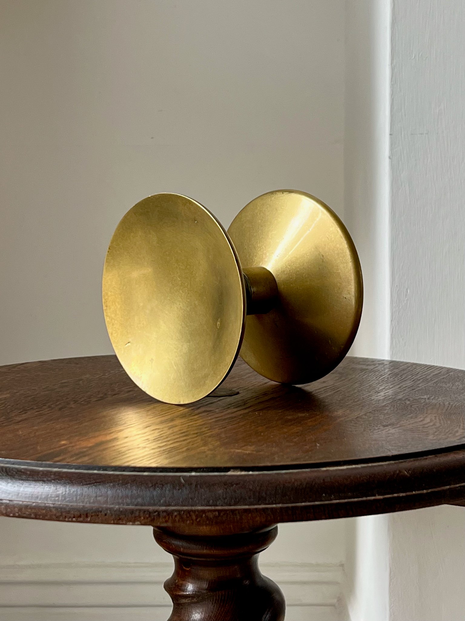 A very simple elegant handle, made up of two separate pieces - each side with a slightly concave dish and wide stem. The components are in fair vintage condition with signs of wear, as one might expect from age and use - including scratches and dings - and a mellow aged patina.