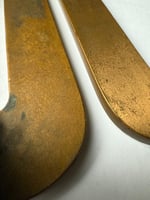 Overall the set is in vintage condition with lots of character. Signs of age and use include light scratches, marks and losses to the lacquer, and we have categorised this set as in fair condition to draw attention to these points. The metal has mid-brown-gold tones with some oxidation and a warm aged patina, which we have left as found.
